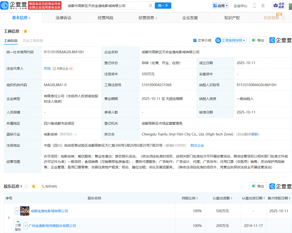 近日,成都市高新区天府金逸电影城有限公司成立,法定代表人为苏鸣,经营范围包含:电影放映;餐饮服务;营业性演出;游艺娱乐活动;票务代理服务;广告制作等。企查查股权穿透显示启灯网,该公司由金逸影视(002905)间接全资持股。