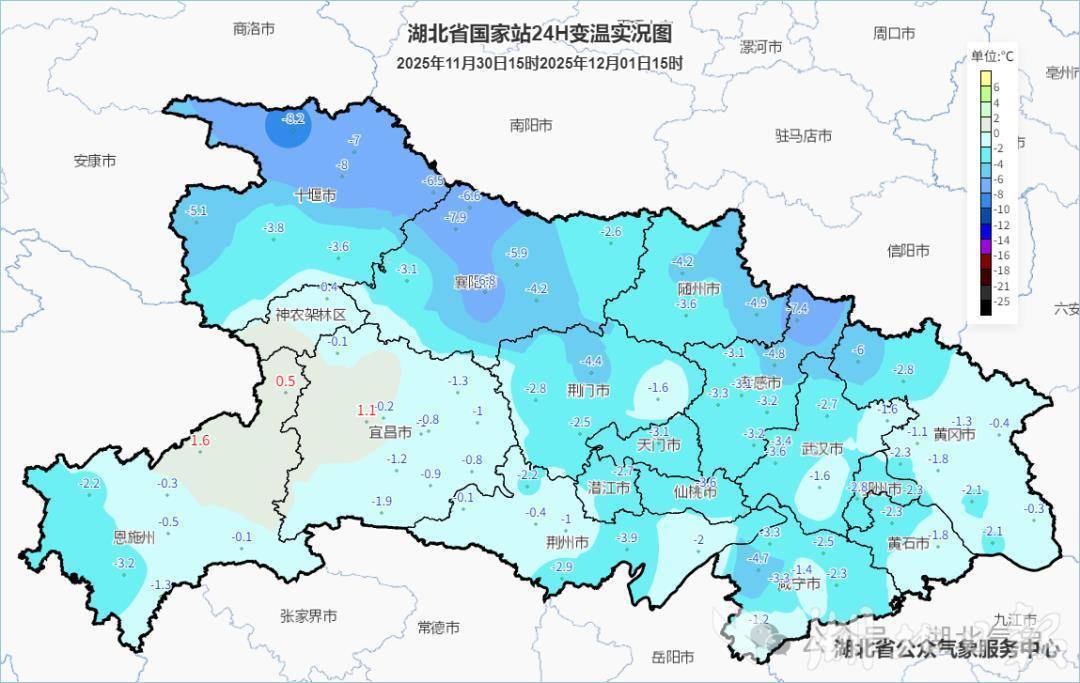 随着冷空气继续向南推,1日湖北大部气温有不同程度下降,其中北部部分地区下降5至8℃。2日全省大部地区将由多云转为阴天,鄂西和鄂东南局地会有小雨,西部高山区还会有雨夹雪或小雪,省内将吹起5到7级偏北阵风。气温下降明显,除鄂东南外,省内其他地区 最高气温降至10至15℃。3至4日,湖北西部和江汉平原南部地区还会有小雨,高海拔地区有零星雨夹雪或雪,气温还将继续下降。4日全省最高气温将降至9至11℃,北部最低气温仅0至4℃。不过,这轮冷空气只是将气温打回到常年正常的温度水平,且冷空气走后气温会迅速回升。12月8日,随着下一波冷空气来袭,气温又会出现波动。此外,受冷空气输送影响,当天十堰、襄阳、随州、孝感、武汉等地15时有浮尘出现,大部地区最小相对湿度不足40%,局部不足20%,空气持续干燥。预计2日湖北中东部地区大部及宜昌、恩施东南部有较高至高森林火险气象等级。