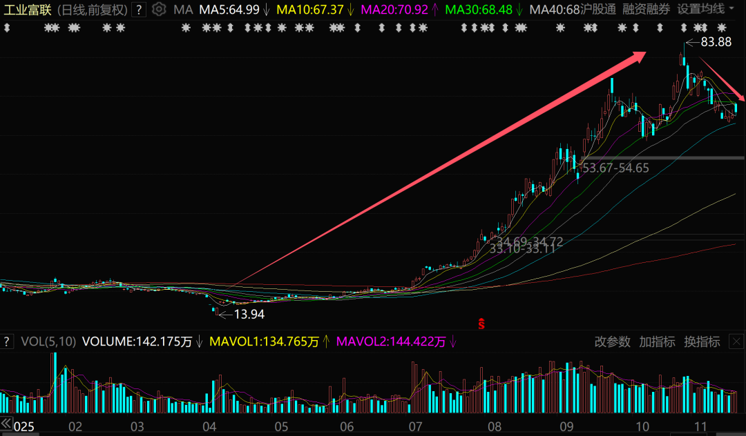 工业富联是从4月初13.94元的低点开始一路上涨,到10月30日的最高点83.88元,近7个月的时间涨幅高达500%。