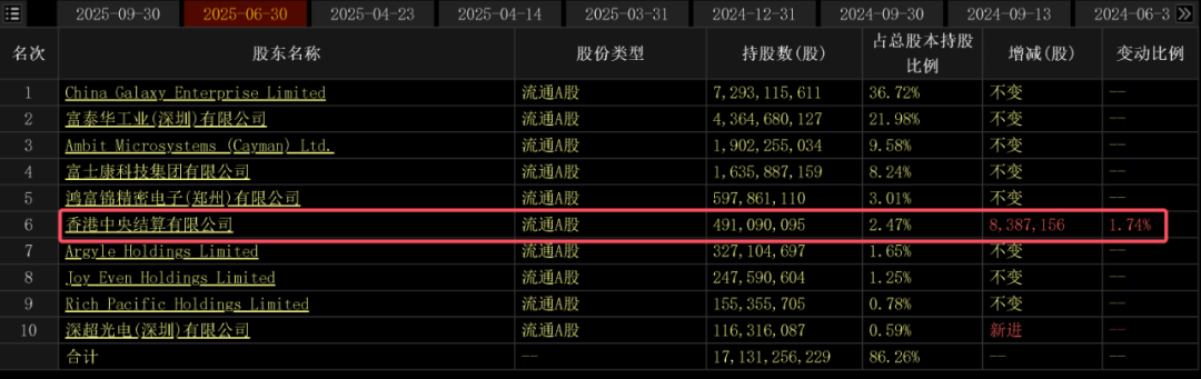 数据显示,工业富联前十大股东中,唯一卖出的是其第六大股东香港中央结算有限公司,三季度减持1.22亿股,减持比例为24.96%。
