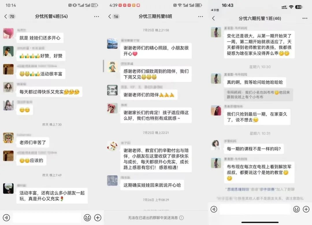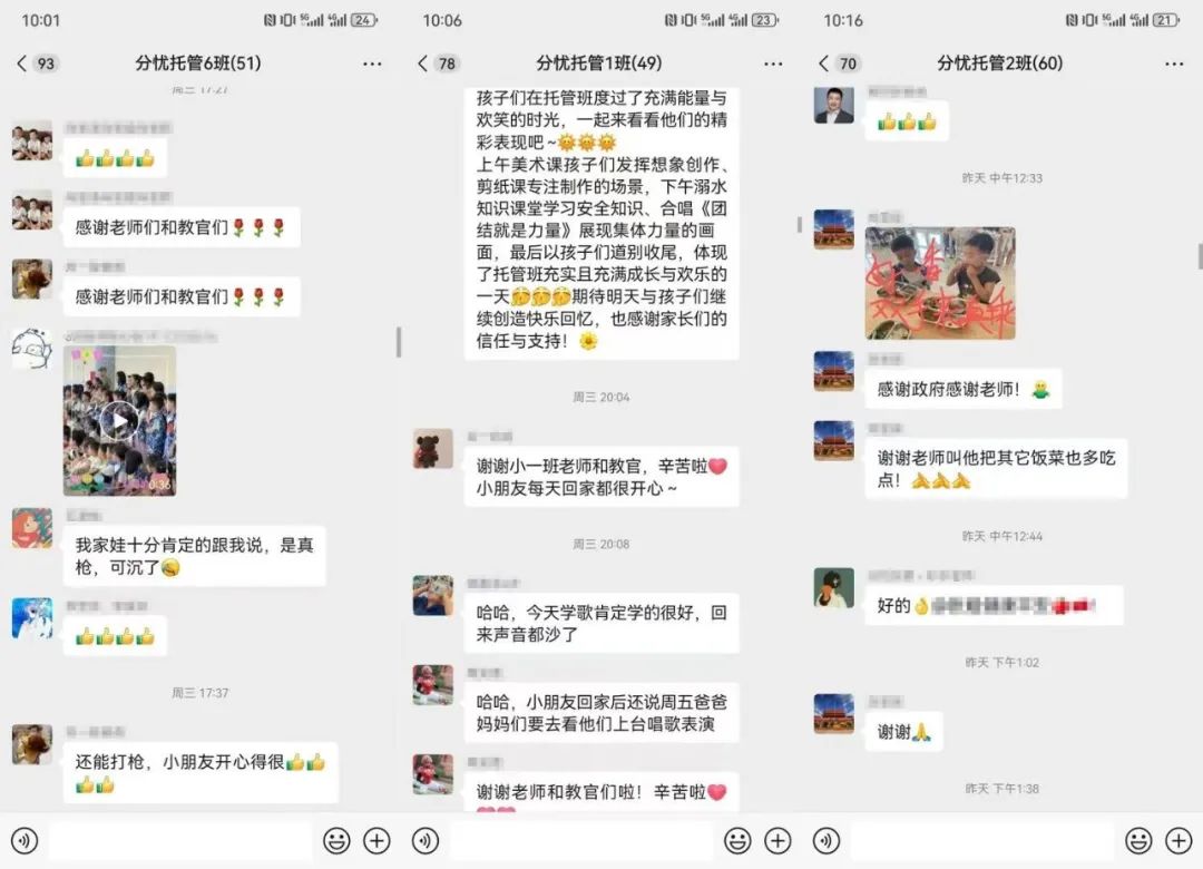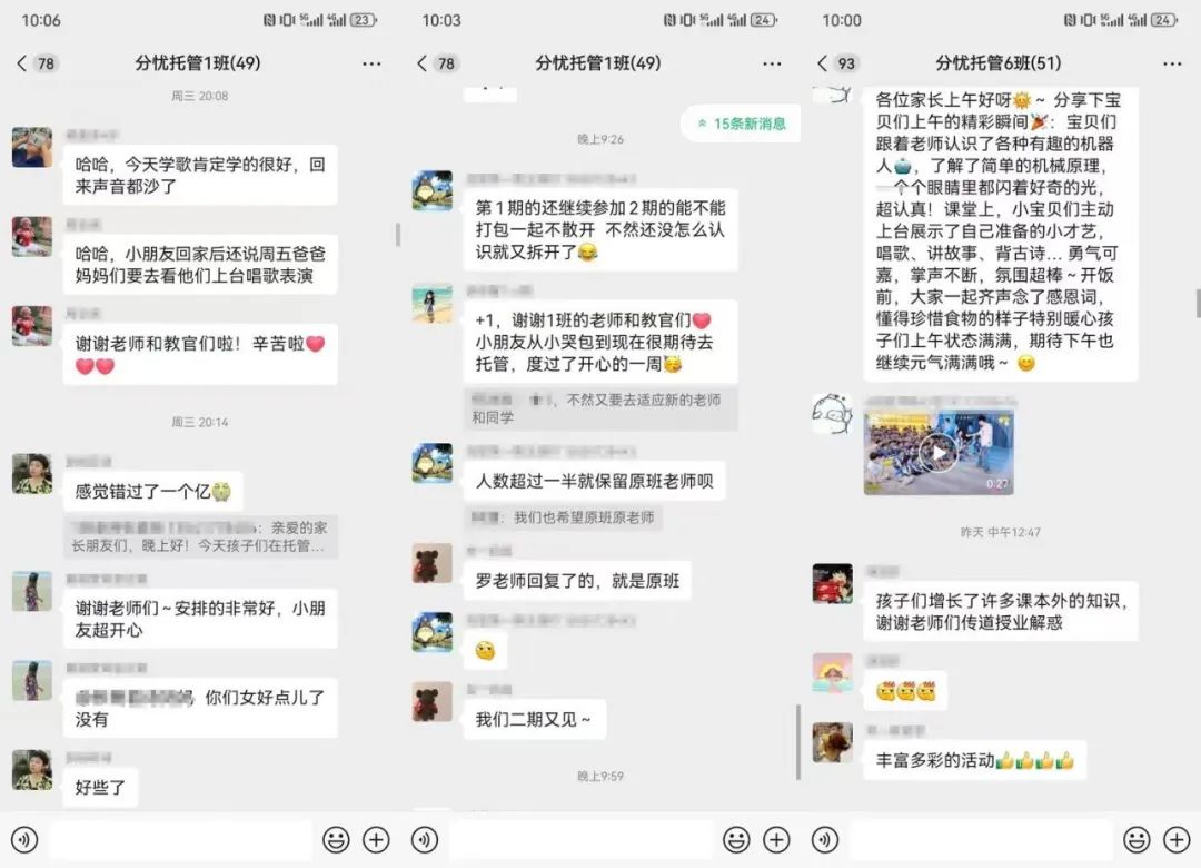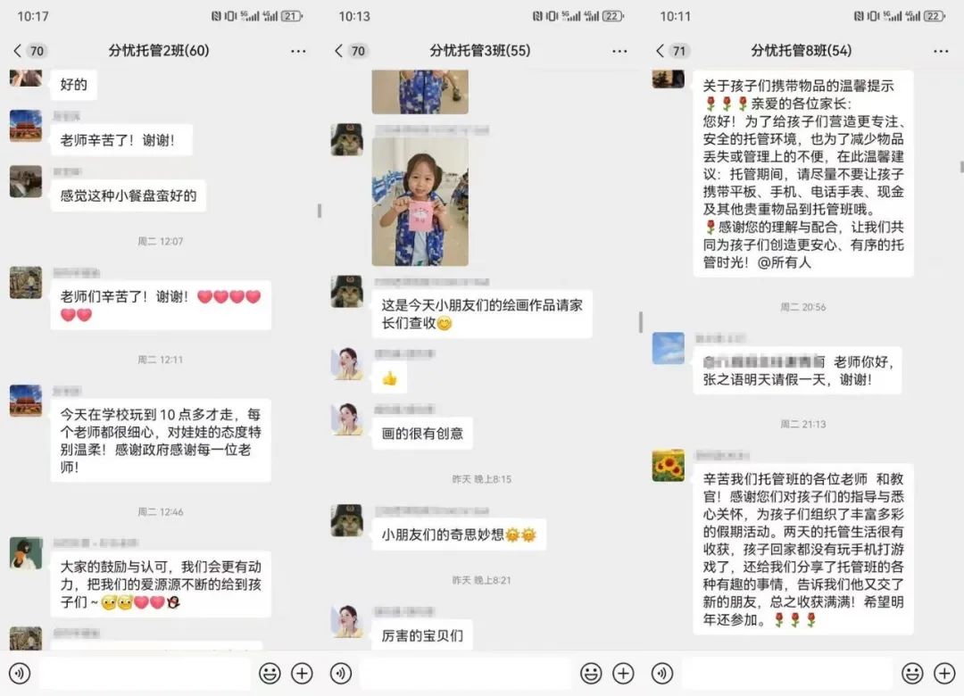 分忧托管班的服务究竟好不好?最有发言权的,无疑是孩子以及家长们了。托管班开办期间,48个家长群内,家长们通过群相册查看孩子的上课照片、视频,实时了解孩子的动态,这份透明与用心让家长们倍感安心。