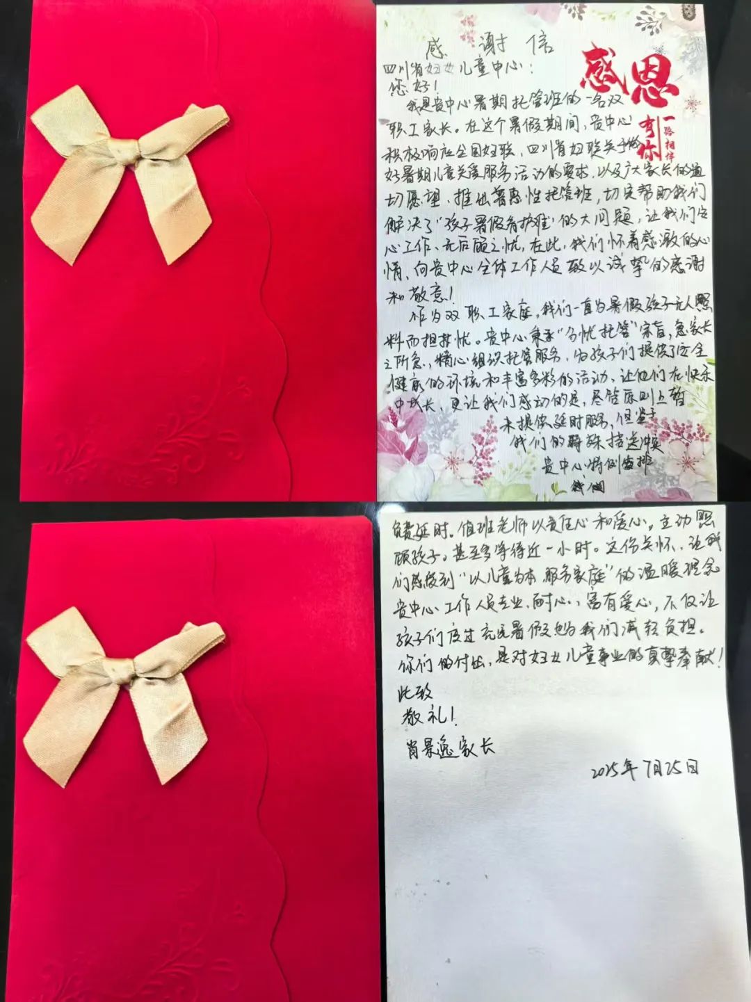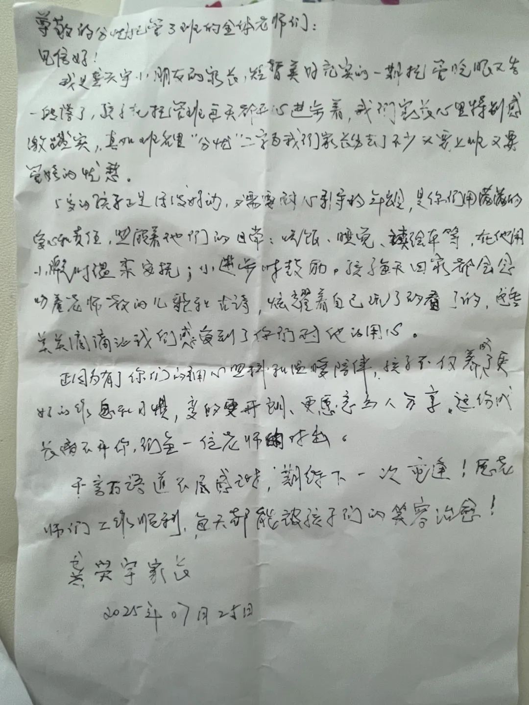 7月11日下午,正是首期分忧托管班结束的日子,滂沱大雨倾盆而下,老师们在大雨中坚守岗位,将孩子们一个又一个的安全交到家长手中,没想到还收到了意想不到的礼物——两封用塑料膜封住的手写感谢信。即便大雨淋湿了包装,但信中的真挚谢意依然清晰,这一幕,是分忧托管班无数温暖瞬间的缩影。