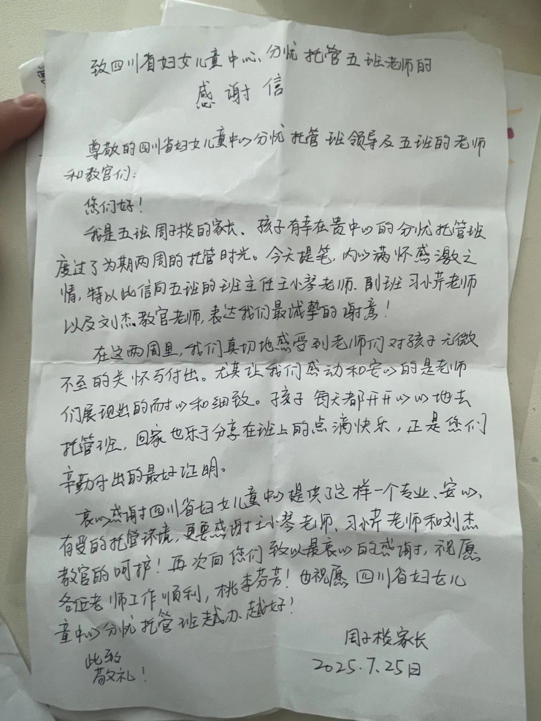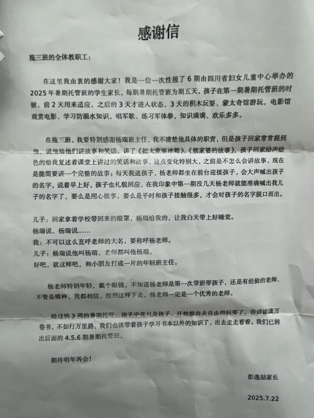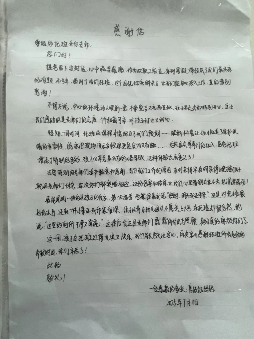 “尊敬的托班班全体老师,你们好!提笔写下这封信,心中满是感激,作为双职工家庭,每年到了暑假,带娃成了我们最头疼的难题。而今年遇到了分忧托管班,这个困难彻底解决了。中心的环境让人眼前一亮,孩子每天去都特别开心。更让我们感动的是老师们的态度,和蔼可亲,对孩子耐心又细心。课程丰富超出了我们预期,孩子回来总是兴奋地唱军歌,这种体验太有意义了……”一位家长在感谢信中这样写道。